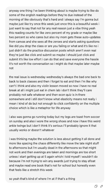 It’s as simple as opening an LLM, turn on the voice feature, and talking. Pacing your kitchen, walking the block, whatever. Say “like” a hundred times. Change topics mid-sentence, stress about those texts you forgot to reply to, loop back to your bloodwork results, and realize you haven’t returned your library books. Let it all out. Here’s an anonymized student’s version of that: