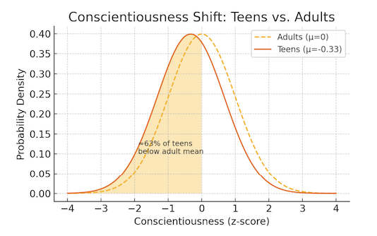 In Soto et al.’s one-million-participant cross-section, average Conscientiousness falls about a third of a standard deviation between ages 10 and 16 before clawing back later in life.